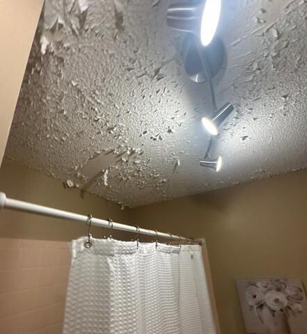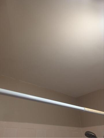 Drywall Doctor repaired the bathroom ceiling after the popcorn texture began peeling due to humidity from the shower. Our team carefully scraped off all the old texture and refinished the surface while keeping the area covered in plastic to ensure no debris was left, leaving the ceiling completely smooth and fresh.