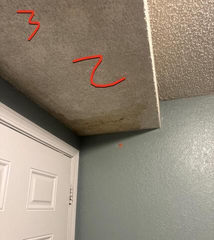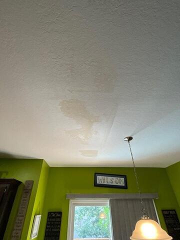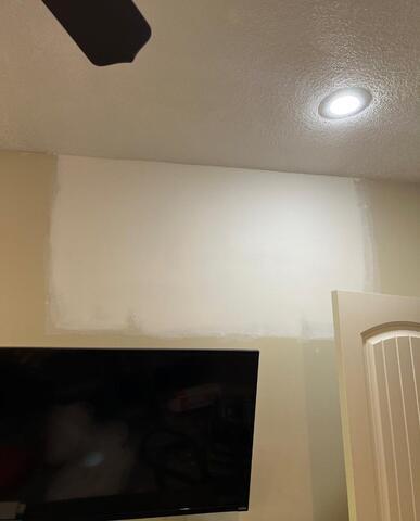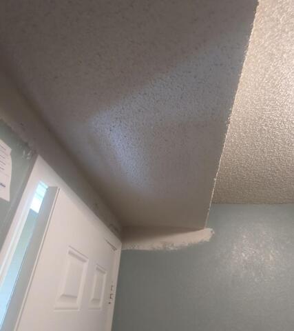 Drywall Doctor repaired the ceiling and wall in this customer's home, and matched the knockdown texture seamlessly.