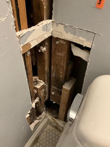 Drywall Doctor repaired the drywall behind the toilet in this Overland Park home after some drywall was removed to repair plumbing.