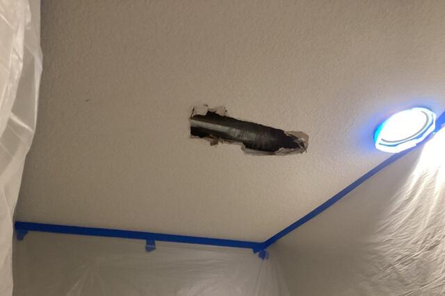 Drywall Doctor repaired the hole in the ceiling and then matched the knockdown texture perfectly. Once the repair was fully dry, the painter carefully painted the entire ceiling to blend seamlessly.