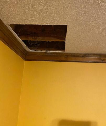 Drywall Doctor repaired the hole in the ceiling and then matched the knockdown texture perfectly. Once the repair was fully dry, the painter carefully painted the entire ceiling to blend seamlessly.