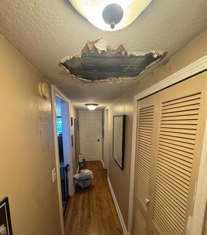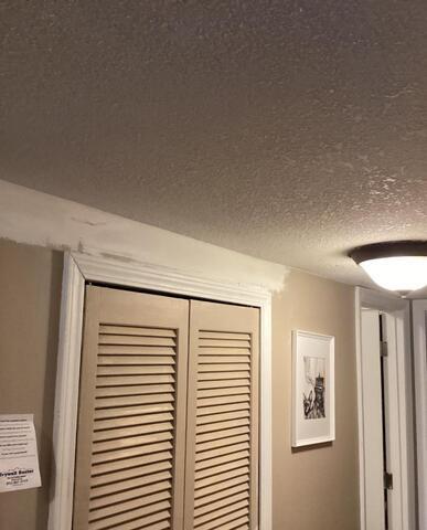 Drywall Doctor was called to repair a large hole in a hallway ceiling after a leak from the upstairs condo caused major water damage. Our repair technician replaced the damaged drywall, applied a knockdown texture to perfectly match the existing ceiling, and restored the area to look like nothing ever happened. The space was left spotless and ready for the customer to enjoy again.